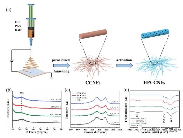 圖1.(a)HPCCNFS的制備工藝示意圖(b-d)CCNFS、HPCCNFS-0、HPCCNFS-1和HPCCNFS-2的XRD圖譜、拉曼光譜和FTIR圖譜,