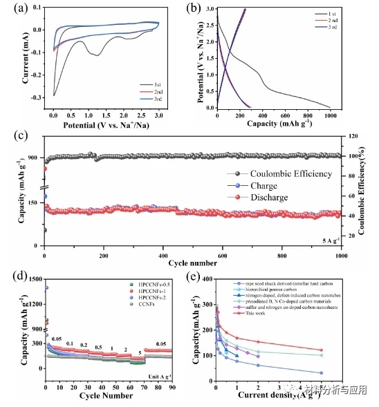 圖3.(a)0.01-3.0V之間的0.1mvsl下的CV曲線,以及(b)0.1AIPCCNFS-1下初始三個循環的充放電曲線;(c)HPCCNFS-1在5Ag-1下的循環性能(d)速率性能,以及(e)HPCCNFS-1與其他碳基陽極材料的速率性能比較