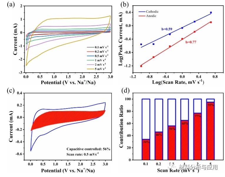 圖4.(a)HPCCNFS-I電極在不同掃描速率下的CV曲線,(b)峰值電流與掃描速率之間的關系,(c)在0.5mvs-1的掃描速率下的電容貢獻曲線,d)HPCCNFS-1電極在不同掃描速率下的電容控制電容貢獻率