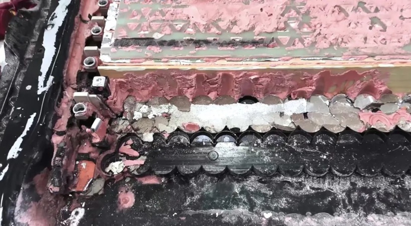 另外,拆解過程還有一個有趣發現是,ModelY底盤上共裝載了828顆電芯,被三塊樹脂類絕緣材料隔斷。馬斯克之前說4680電池“完全取消傳統模組”,但這個設計更像是棄用了傳統物理隔板做出的讓步。