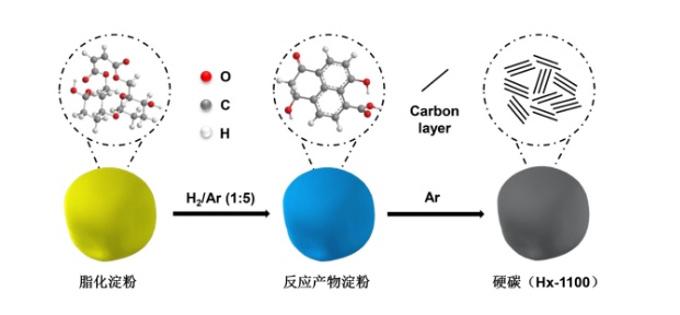 中國科學院山西煤炭化學研究所的陳成猛研究員領銜團隊,利用富含氧元素的酯化淀粉,通過化學反應制備了一種鈉離子電池負極材料——硬碳,并研究了反應中間產物前驅體的氧元素含量對該硬碳負極材料電化學性能的影響。
