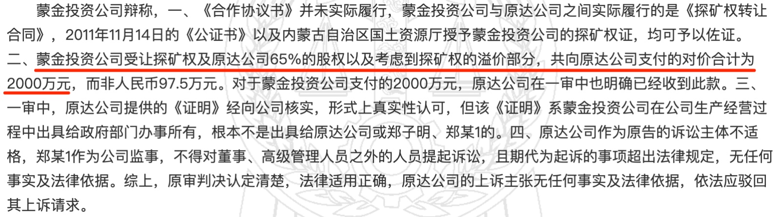 據中國裁判文書網案號為“(2019)內25民終1234號”的終審判決文書顯示,彼時和蒙金礦業為同一實控人的內蒙古蒙金礦業投資有限公司(簡稱“蒙金投資”)在2009年受讓內蒙古鑲黃旗原達礦業有限責任公司(簡稱“原達礦業”)的內蒙古自治區鑲黃旗加不斯鈮鉭礦探礦權及原達礦業65%股份,支付交易對價2000萬元。2013年8月,蒙金投資將該探礦權轉讓給蒙金礦業,2014年11月,蒙金礦業經審批后將該礦的探礦權轉為采礦權。