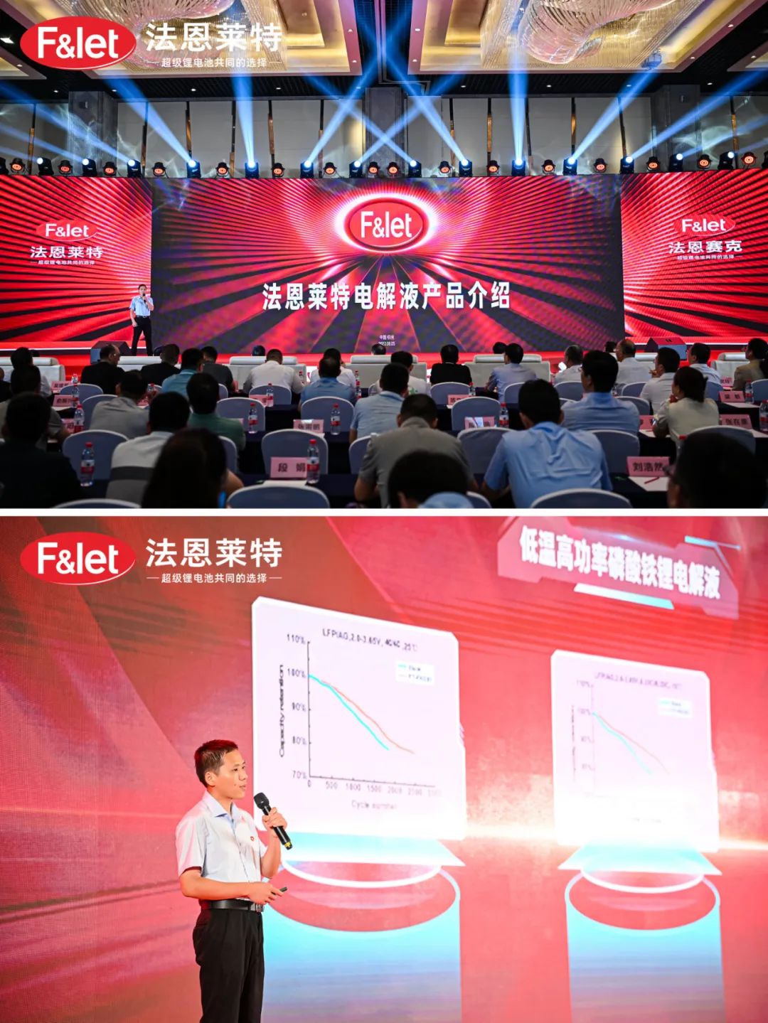 在本次會議現場,法恩萊特研發總監張勇來介紹了包含低溫高功率磷酸鐵鋰電解液、三元高電壓電解液、半固態電解質、鈉離子電池電解液在內的全系產品解決方案,向大家介紹了法恩萊特國內+國外多家電解液工廠的規劃布局,并對各個工廠的數字化、智能化、自動化管理模式進行了講解和闡釋。同時,分享了法恩萊特基于動力、儲能、消費電池等高能量密度、高安全、高循環壽命所研發出的技術成果,其相關產品經過多輪樣品測試驗證及可靠性驗證,可確保高性能及高安全性,已大批量投放市場并獲得客戶好評。