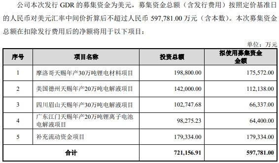 具體來看,天賜材料表示,募集資金總額在扣除發(fā)行費用后的凈額將用于以下項目:摩洛哥天賜年產(chǎn)30萬噸鋰電材料項目、美國德州天賜年產(chǎn)20萬噸電解液項目、四川眉山天賜年產(chǎn)30萬噸電解液項目、廣東江門天賜年產(chǎn)20萬噸鋰離子電池電解液項目及補充流動資金項目。