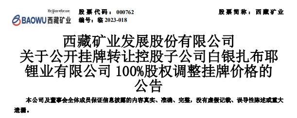 9月22日,礦業巨頭西藏礦業發布公告稱,按照《企業國有資產交易監督管理辦法》(32號令)相關交易規則以及相關管理文件規定,經公司管理層同意 , 白銀扎布耶100%股權掛牌轉讓底價調整為2.73564億元(在首次掛牌價格的基礎上降價60%),并委托上海聯合產權交易所進行第七輪公開掛牌轉讓。