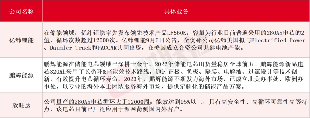 據(jù)財聯(lián)社不完全整理,出口海外的儲能電芯A股上市公司主要為億緯鋰能、鵬輝能源、欣旺達等,還包括自研電芯配套戶儲終端產(chǎn)品的企業(yè),如比亞迪、派能科技等。而另一邊,儲能電池出海的風(fēng)吹向了大儲,截至目前,已經(jīng)有包括瑞浦蘭鈞、遠景動力、海辰儲能、億緯鋰能等多家企業(yè)獲海外儲能集成商大單,單筆最大訂單已達10GWh。A股上市公司具體業(yè)務(wù)如下: