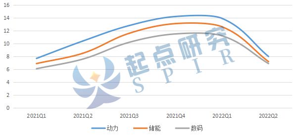 從電解液下游應用場景來看,2022H1動力領域仍占大頭,占比70.7%;其次是儲能領域,占比16.2%;數碼領域占比13.1%。起點研究認為未來幾年動力領域仍將是電解液應用的大頭;隨著儲能逐步崛起,各地的政策扶持,電解液在儲能領域的應用在未來幾年占比將繼續提升;3C數碼等消費領域主要以存量為主,增長乏力,未來幾年電解液在數碼等領域的占比將會繼續縮小。