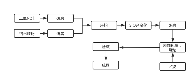 硅氧負極的核心是制備SiOx。大部分的企業是將純硅和SiO2合成SiOx,形成硅氧負極前驅體,然后經粉碎、分級、表面處理、燒結、篩分、除磁等工序制備而成。
