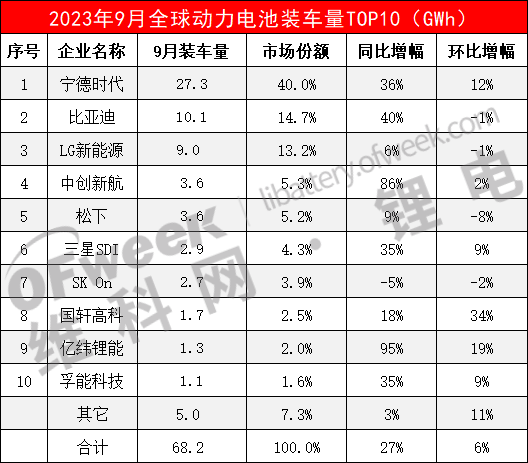 圖:2023年9月全球動(dòng)力電池裝車量排行榜