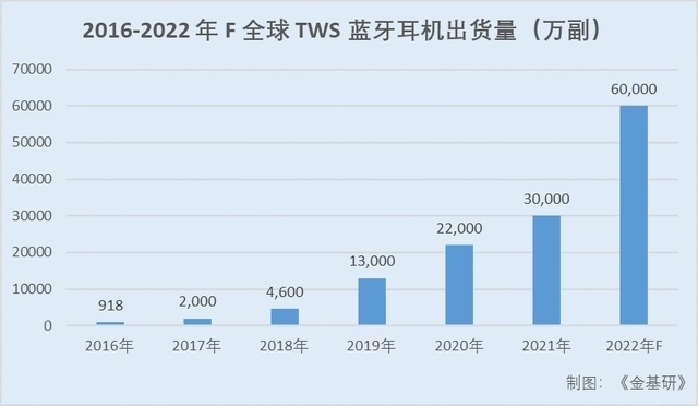 同時(shí),2021年全球TWS藍(lán)牙耳機(jī)出貨量達(dá)到3億副,2022年出貨量將迅速增長至6億副,2019-2022年間的復(fù)合增長率將達(dá)66.5%。