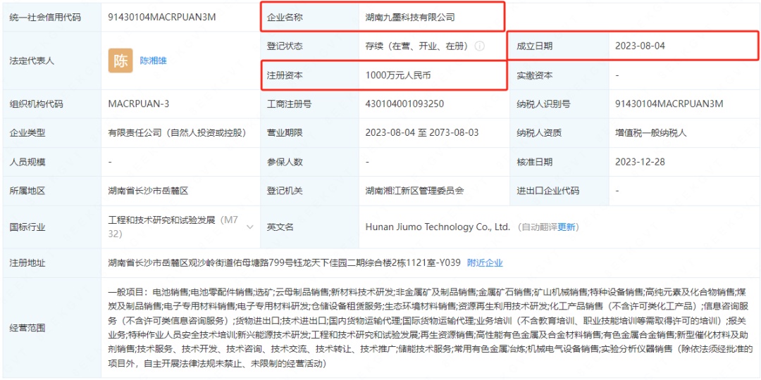資料顯示,九墨科技是鋰電行業中的“新兵”,其成立于2023年8月4日,法定代表人陳湘雄,注冊資本1000萬元人民幣,陳湘雄持股90%,劉金龍持股10%。