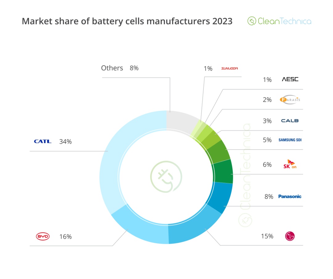 LG的份額在2023年有所下降,從2022年的17%降低到2023年底的15%。Clean Technica認為這是由于客戶端銷量不及預期所致——通用汽車的電動車市場表現乏力,一些重要車型(如雷諾Zoe)臨近產品生命周期末期,其他一些客戶(如奔馳或福特)的銷量增長放緩。