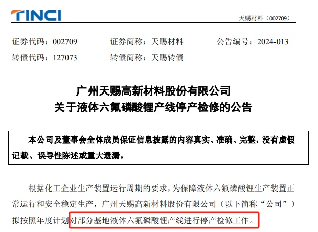 具體看來,天賜材料計劃于 2024 年 3 月 11 日開始,對年產(chǎn) 3 萬噸液體六氟磷酸鋰產(chǎn)線進行停產(chǎn)檢修,預計檢修時間不超過 30 天。