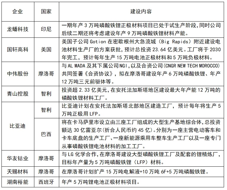 在此背景下,未來一段時間海外市場對磷酸鐵鋰正極材料的需求也有望開始放量。同時,國內多家正極材料企業已經啟動在海外進行磷酸鐵鋰材料布局。