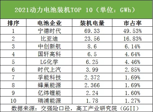 2021年中國新能源汽車銷售約302.9萬輛,同比增長143%;動力電池裝機量約139.98GWh,同比增長128%。其中,寧德時代2021年動力電池裝機量69.33GWh,同比增長132%,國內(nèi)市場占有率達(dá)到49.53%,領(lǐng)先第二名比亞迪市占率超32%。