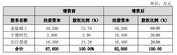 公告稱,本次增資完成后,寧德時代將持有目標(biāo)公司20%的股權(quán),目標(biāo)公司注冊資本將增加至8.2億元。