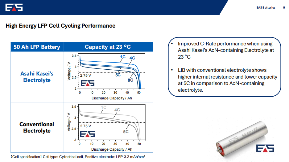 此外,EAS公司的董事總經理Michael Deutmeyer表示,將旭化成電解液技術應用于其以磷酸鐵鋰(LFP)為正極的圓柱型超高功率鋰離子電池,并計劃于2026年3月推向市場。同時,EAS公司也計劃在葡萄牙建設生產基地用于規模化生產,專注于高功率和高能量的磷酸鐵鋰電池。其應用包括但不僅限于海事,工程,電動汽車,移動出行等相關的工業領域。