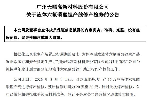1月5日晚間,天賜材料披露公告顯示,根據(jù)化工企業(yè)生產(chǎn)裝置運(yùn)行周期的要求,為保障后續(xù)液體六氟磷酸鋰生產(chǎn)裝置正常運(yùn)行和安全穩(wěn)定生產(chǎn),公司計(jì)劃于2026年3月1日起,對龍山北基地年產(chǎn)15萬噸液體六氟磷酸鋰產(chǎn)線進(jìn)行停產(chǎn)檢修,預(yù)計(jì)檢修時間為20天至30天。