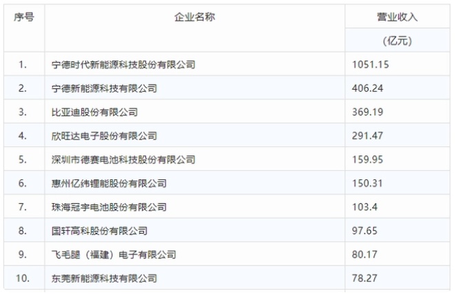 根據中國化學與物理電源行業協會日前發布的2021年國內鋰離子電池企業營收(僅統計鋰離子電芯及動力用、消費類產品用和儲能用鋰離子電池模組或系統)排名名單,前十強企業分別是: