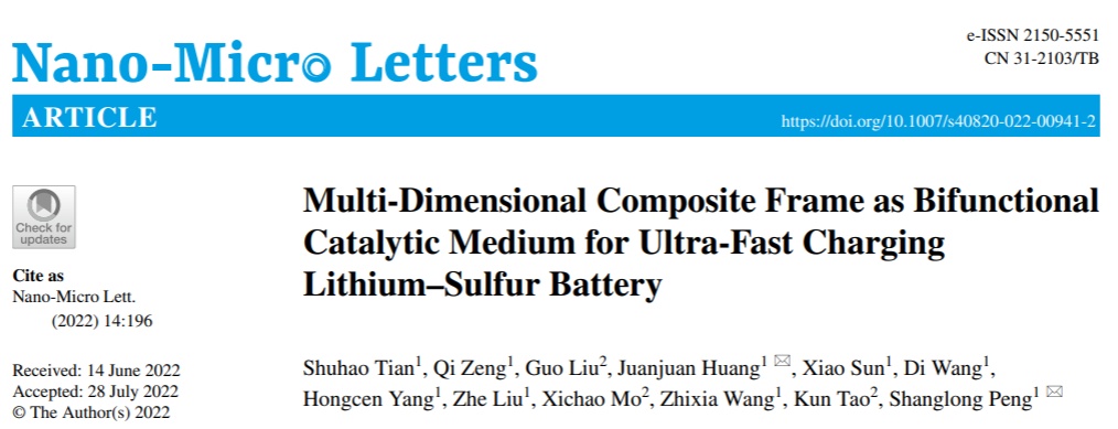 近日,Nano-Micro Letters上發表了一篇題Multi-Dimensional Composite Frame as Bifunctional Catalytic Medium for Ultra-Fast Charging Lithium–Sulfur Battery的文章,該工作提出了一種多維復合框架改性鋰硫電池的隔膜(MCCoS/PP)。MCCoS/PP既能促進還原過程中的液固轉化,又能加速氧化過程中不溶性Li2S的分解。采用MCCoS/PP的鋰硫電池在20C時的比容量為368.6mAhg-1,在7C下1000次循環時的容量衰減僅為0.033%。此外,在高硫負載(7.7mgcm?2)和低電解質/硫比(7.5μLmg-1)的情況下,實現了高面積容量(6.34mAhcm-2)。