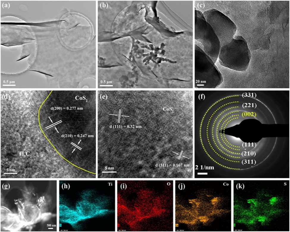 圖1MX的TEM圖像。b,cTEM圖像,d,eHRTEM圖像,f選區電子衍射圖,g-kMX@CoS2的HAADF-STEM圖像及相應的EDS元素能譜。@TheAuthors