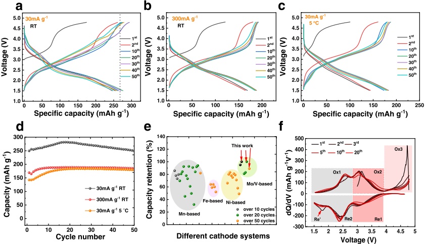 該材料在室溫,電流密度為30mAg-1時,首圈放電容量為249mAhg-1,50圈循環后容量保持率為89%,并且其氧化還原峰(dQ/dV曲線)在電化學循環中移動較小。在低溫(5℃),電流密度為30mAg-1時,首圈放電容量為184mAhg-1,50圈循環后無容量的衰減。在室溫,高倍率時(電流密度為300mAg-1),其首圈放電容量為189mAhg-1,50圈循環后容量保持率為96%。顯示出優異的電化學穩定性相較于其他材料。