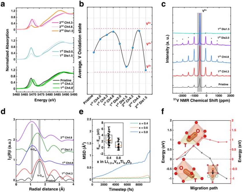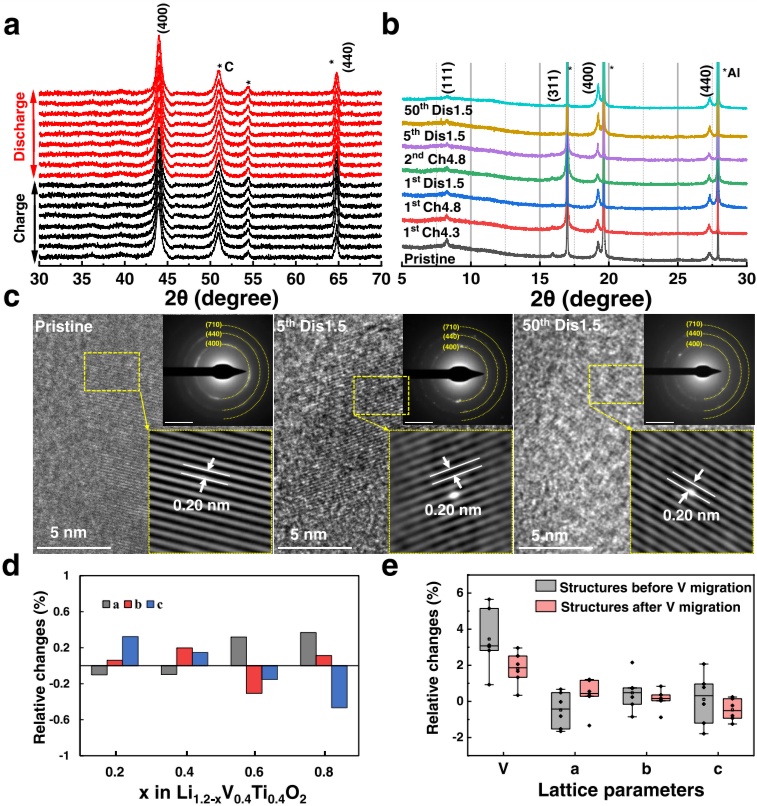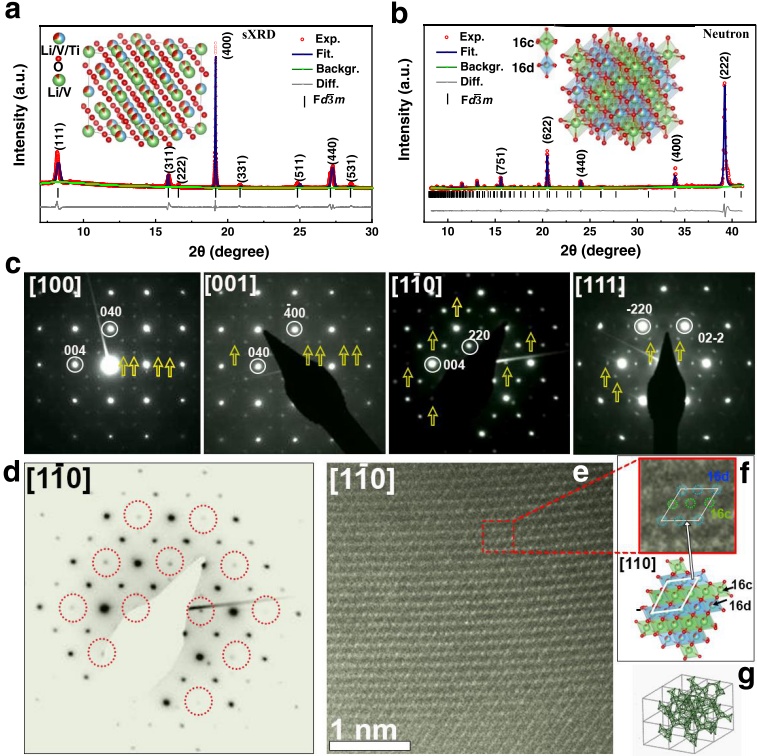 1.設計合成了一種新的富鋰陽離子有序巖鹽氧化物LixV0.4Ti0.4O2,在陽離子有序巖鹽結構中(圖1b中的插圖),一部分Li與V和Ti原子共享16d位點,其余部分Li與V(但不與Ti)共享16c位點。