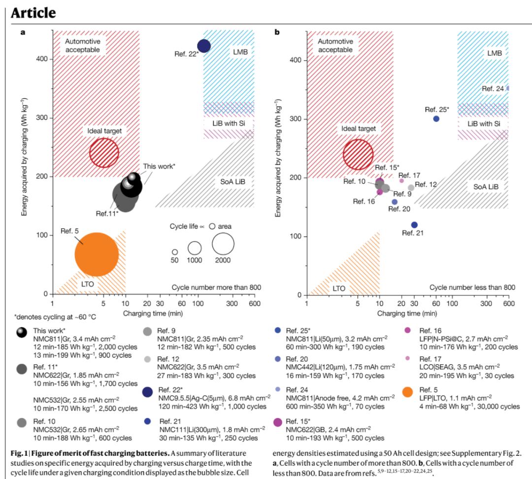 想要電池快速充電必須同時滿足三個評估指標:(1)充電時間(2)獲得的比能(3)快速充電條件下的循環次數。缺少這三個指標中的任何一個都是不充分的或具有誤導性的。