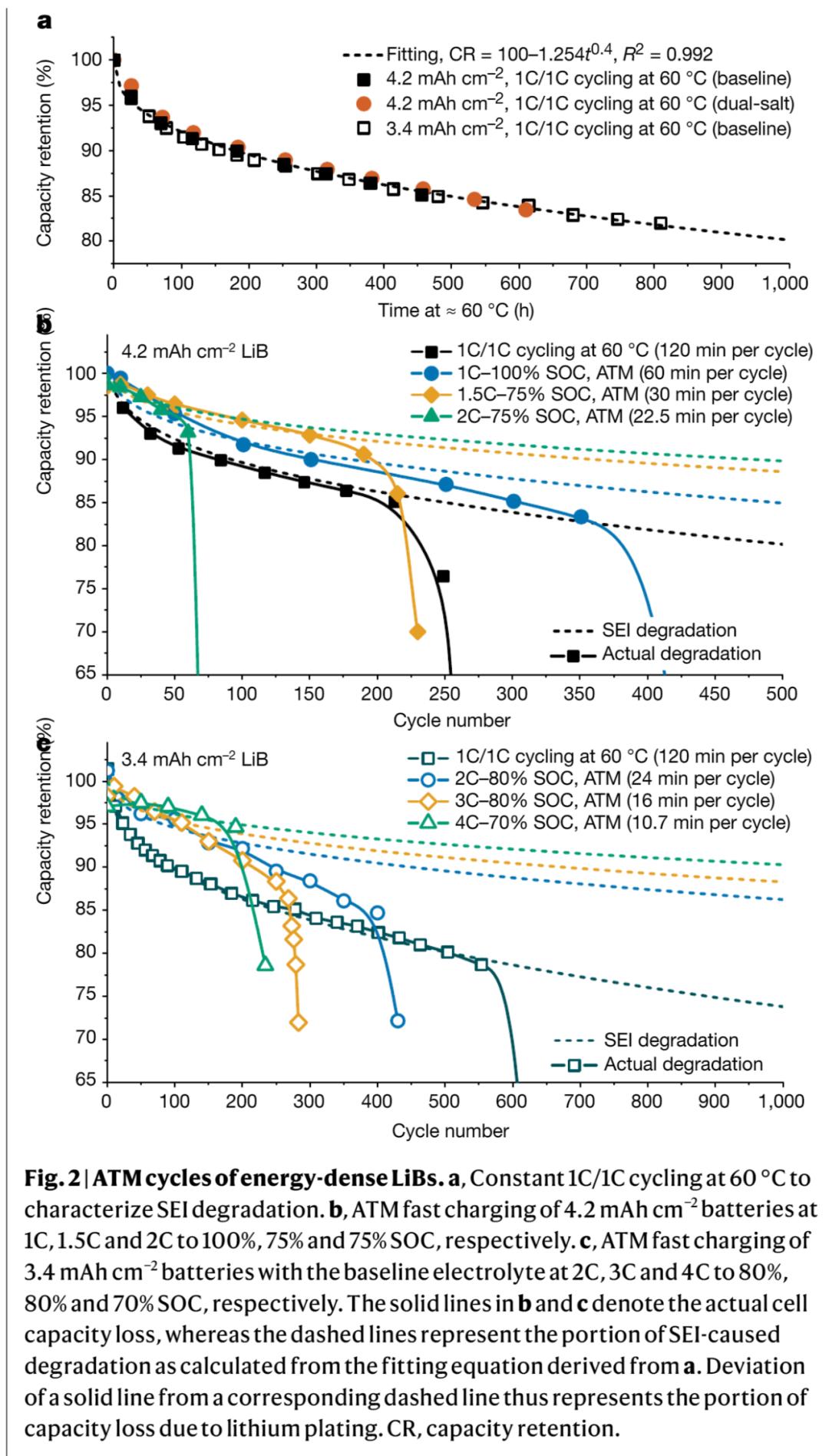 在這項工作中,本文使用能量密度更高的 NMC811 陰極材料電池。下圖 2 為 ATM 方法下的高比能鋰離子電池容量衰減曲線。下圖表明,僅使用 ATM 無法實現不鍍鋰的高能電池的 15 分鐘 / 4C 快速充電;電解質的傳輸性質需要進一步加強。