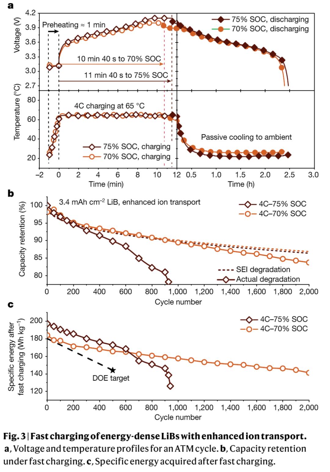 為了實現 15 分鐘獲得 240 Wh kg^-1 比能和超過 800 次循環的目標,本文選擇了面積容量為 3.4 mAh cm^-2 的 LiNi_0.8Mn_0.1Co_0.1O_2 (NMC811) 作為陰極。通過將 ATM (asymmetric temperature modulation)方法與雙鹽電解質和更大孔隙率的陽極相結合,來改善離子傳輸,因而本文展示了一種適用于汽車的解決方案。