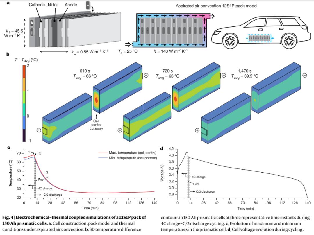 最后,基于上述改進,本文評估了 ATM 策略在電池組水平上對電池冷卻和安全性的影響。模擬發現電池在 C/3 放電后需要 11.6 分鐘才能冷卻到 40 °C 以下(圖4c),在單個電池測試中觀察到大約需要 8 分鐘(圖3a),假如在進行一些優化,這個時間可以減少到大約 5 分鐘。這些數值結果證明了支持 ATM 的電池組實現安全 4C 充電的可行性。