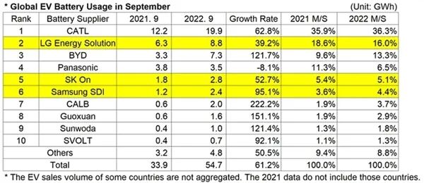 日本松下公司的動力電池裝車量為27.8 GWh,排在第四,同比增長率僅為4.4%,也是此次前十名榜單中唯一一家同比增長率僅為個位數(shù)的企業(yè)。公司市場份額從去年同期的13.6%大幅下滑到今年的8.1%。而其在9月的裝車量同比更是出現(xiàn)了負(fù)增長,單月裝車量僅為3.5 GWh,同比下降8.1%,也是前十名榜單中唯一一家單月裝機(jī)量負(fù)增長的企業(yè)。