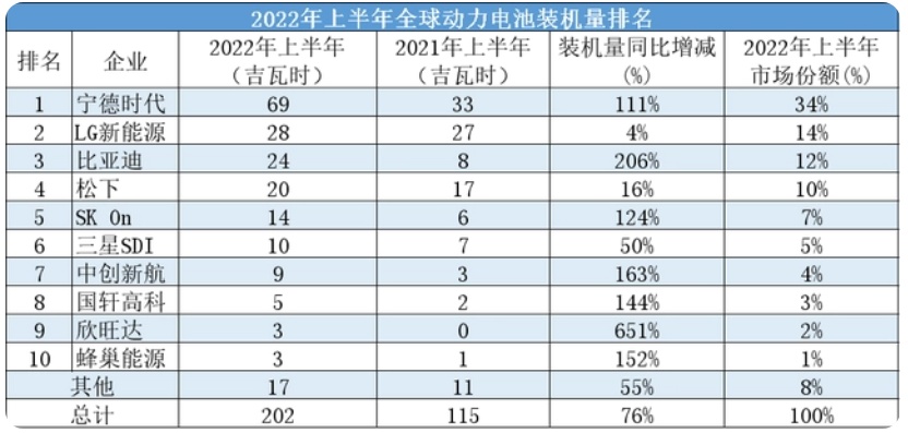 動力電池巨大的市場潛力吸引著各電池企業的爭奪。據SNE Research數據統計,2022年上半年,在裝機量方面,寧德時代同比增長111%,繼續占據全球第一;韓國LG新能源以28吉瓦時位居第二,同比僅增長4%,與寧德時代拉開距離;比亞迪取代日本松下,以24吉瓦時的裝機量躋身第三,同比猛增206%。