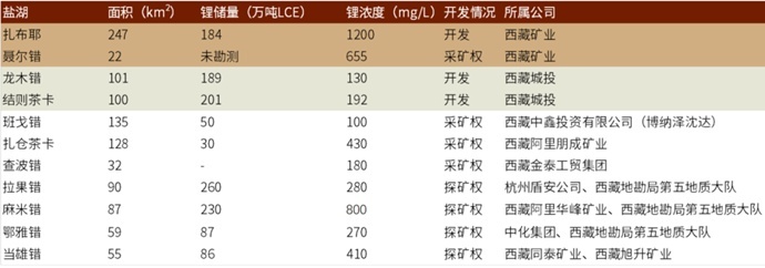 西藏富鋰鹽湖數(shù)量眾多且資源稟賦出色,目前西藏的扎布耶鹽湖、結(jié)則茶卡鹽湖和龍木措鹽湖已經(jīng)開(kāi)發(fā),這幾個(gè)鹽湖資源稟賦優(yōu)異且鹽湖資源的開(kāi)發(fā)進(jìn)程相對(duì)領(lǐng)先。但是,除了這幾個(gè)鹽湖外,西藏仍有許多稟賦優(yōu)良的鹽湖。