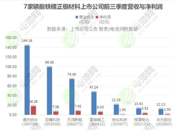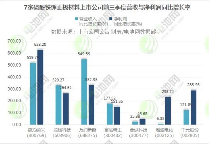 據(jù)資料統(tǒng)計在內的7家磷酸鐵鋰正極材料上市公司,前三季度營業(yè)收入與凈利潤均雙雙實現(xiàn)增長,營業(yè)收入合計達412億元,凈利潤合計超45億元。其中,德方納米、萬潤新能前三季度營業(yè)收入同比增逾5倍,德方納米前三季度凈利同比增逾6倍。