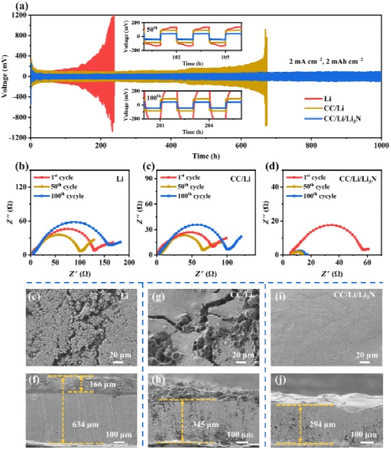 圖3.CC/Li/Li3N為工作電極組裝的對稱電池循環(huán)性能和循環(huán)后的電極形貌