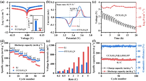 為了進一步評估CC/Li/Li3N電極在實際應用中的可行性,通過全電池測試探索了其電化學性能。CC/Li/Li3N||LFP全電池在液態(tài)電解質(zhì)中顯示出良好的倍率性能和循環(huán)穩(wěn)定性,并且在固態(tài)電池中經(jīng)過100次循環(huán)后顯示出96.7%的高容量保持率。
