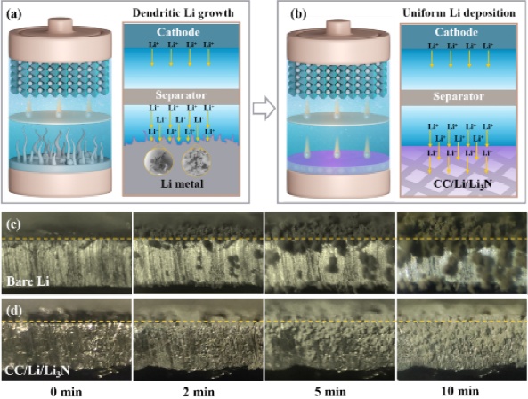 圖5.Li+在CC/Li/Li3N電極上的傳輸機理示意圖及原位光學顯微鏡觀察鋰沉積