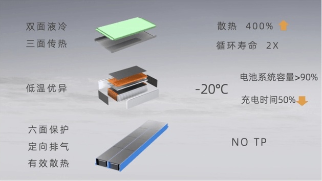 孚能科技的SPS方案中,液冷板和導熱片的復合使用,給大軟包電芯提供了“雙面液冷,三面?zhèn)鳠帷钡母咝峤粨Q,電池系統(tǒng)的散熱效率提升4倍,加上精準的控溫AI-BMS,電池系統(tǒng)循環(huán)壽命超過3000次。麒麟電池通過全新的多功能彈性夾層,以及重新設計置于側面而非頂部的水冷系統(tǒng),從而使換熱面積擴大4倍,電芯控溫時間縮短至原來的一半。可以看到,擴大散熱面積,滿足3C甚至4C的高壓充電是這兩種技術方案的主要訴求。