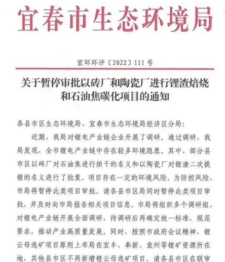 近日,宜春市生態環境局發布《關于暫停審批以磚廠和陶瓷廠進行鋰渣焙燒和石油焦碳化項目的通知》。通知顯示,該局經過近期調研發現,市內鋰電產業鏈企業存在較多隱患。其中,部分縣市區以磚廠對石油焦進行烘干的名義和以陶瓷廠對鋰渣二次提鋰的名義進行了批復的項目存在一定的環境風險。為防控風險,市局將暫停此類項目審批,并要求各縣市區暫停此類項目審批。