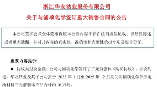 華友鈷業公告顯示,該公司與浦項化學簽訂了三元前驅體《購買協議》,華友鈷業及其子公司擬于2023年1月至2025年12 月期間向浦項化學供應電池材料三元前驅體產品合計約16萬噸。