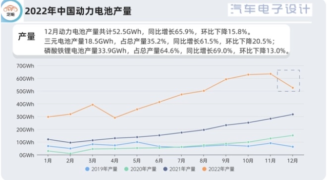 12月動(dòng)力電池產(chǎn)量共計(jì)52.5GWh,環(huán)比下降15.8%,這個(gè)還是在意料之中的。2022年動(dòng)力電池累計(jì)產(chǎn)量545.9GWh,這個(gè)數(shù)據(jù)確實(shí)很高了。朱校長(zhǎng)認(rèn)為:9月開始60GWh的產(chǎn)量,有很大一部份是為了出口的,疊加年底為了補(bǔ)貼退坡的政策沖量,兩個(gè)強(qiáng)需求使得國(guó)內(nèi)的電池量一下子上去了。而12月的下降主要是因?yàn)閷?duì)明年市場(chǎng)的觀望。