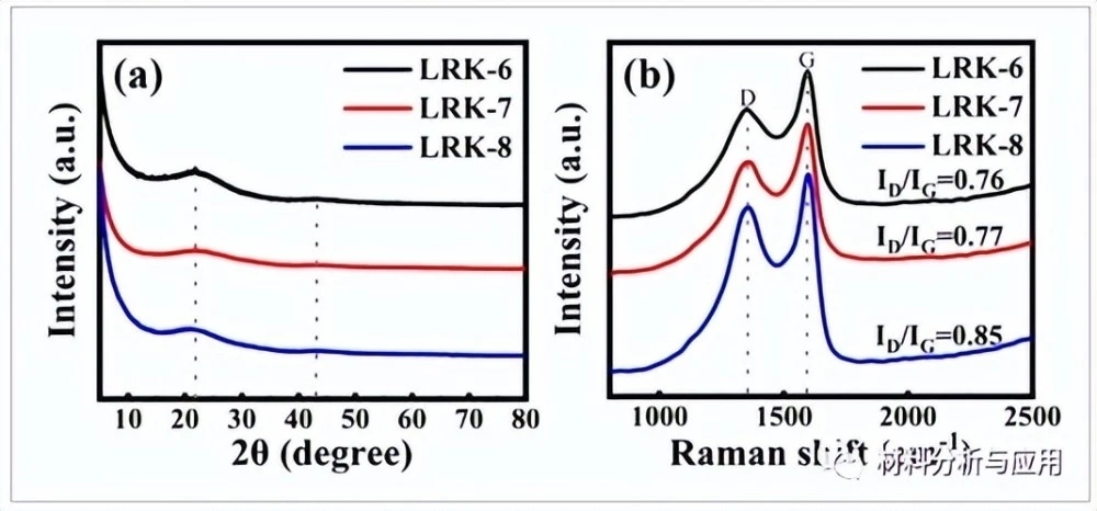 圖1、(a)XRD圖案和(b)LRK-6、LRK-7和LRK-8材料的拉曼光譜。