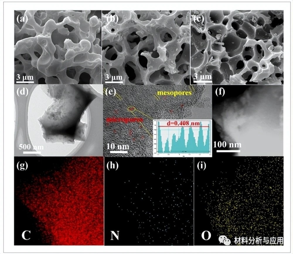 圖2、(a)LRK-6、(b)LRK-7和(c)LRK-8的SEM圖像;(df)LRK-7的TEM圖像;(gi)LRK-7的C、N和O的相應EDS映射。