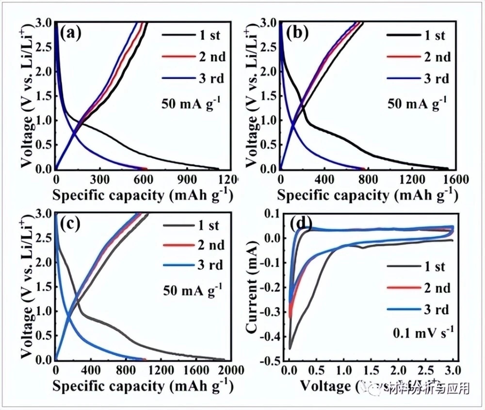圖3、(a)LRK-6、(b)LRK-8和(c)LRK-7的前三個放電/充電電壓與比容量曲線;(d)LRK-7前三個循環在0.1mVs-1時的CV曲線。